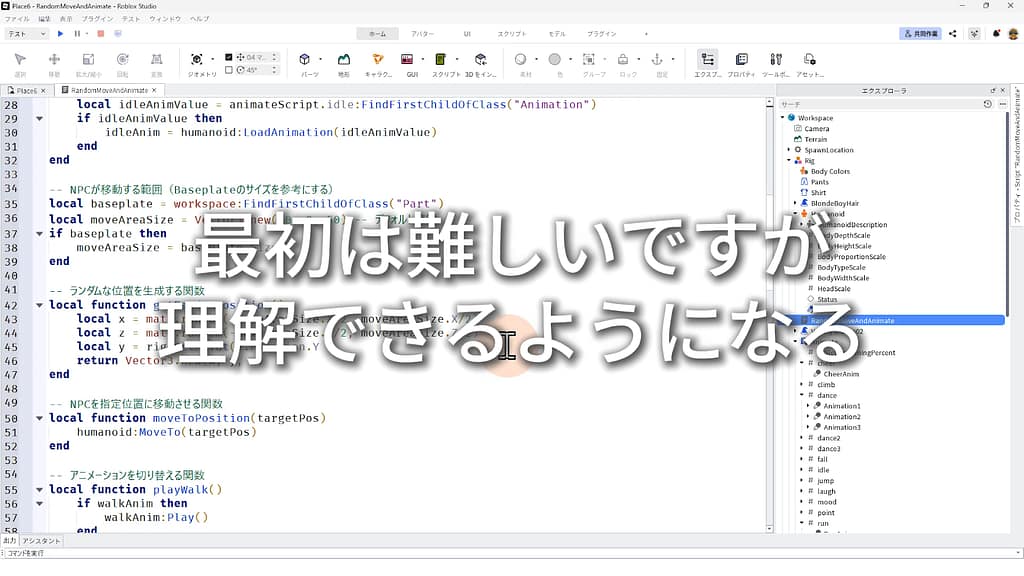 今回は「R15のNPC Rigを、ランダムに移動させ、移動中はwalkのアニメーション、停止中はidleのアニメーションが適用されるスクリプトを作って。なお、スクリプトのコメント文は日本語でお願い。」とAIに依頼しました。