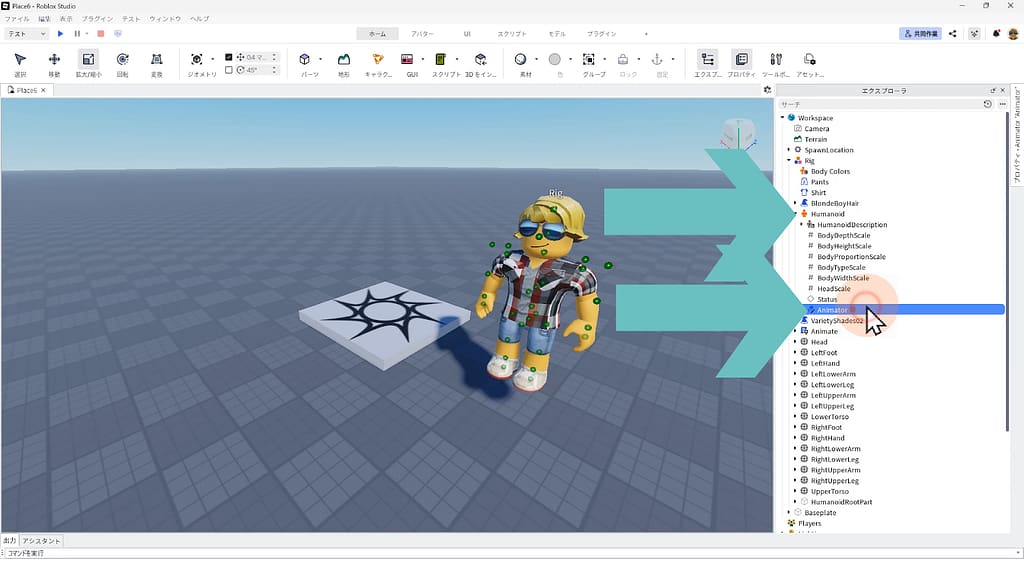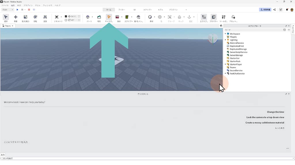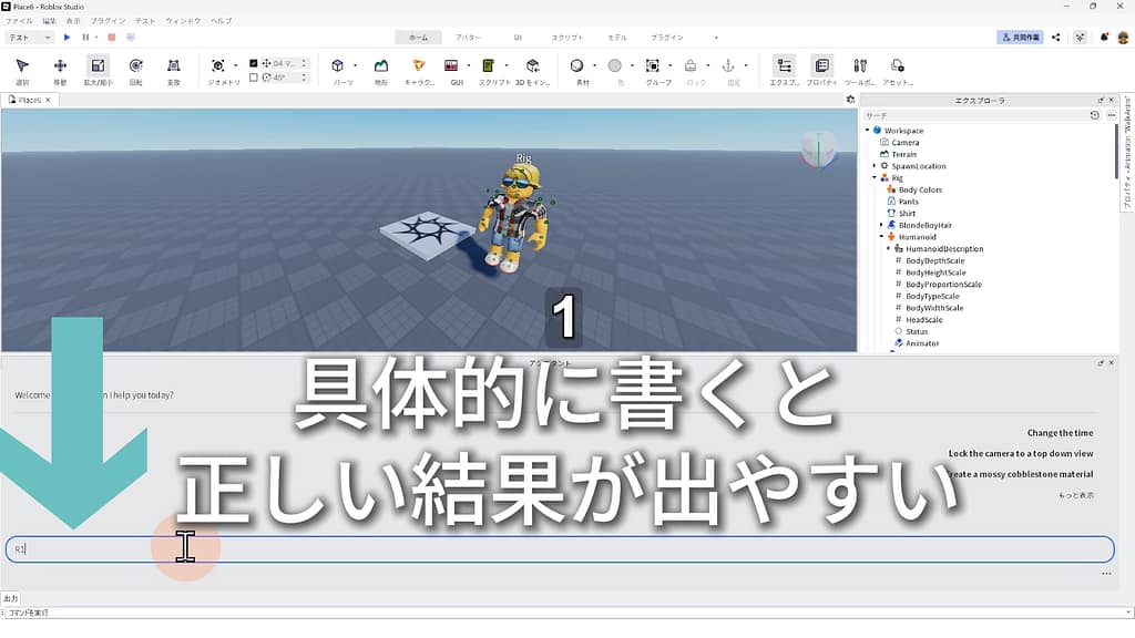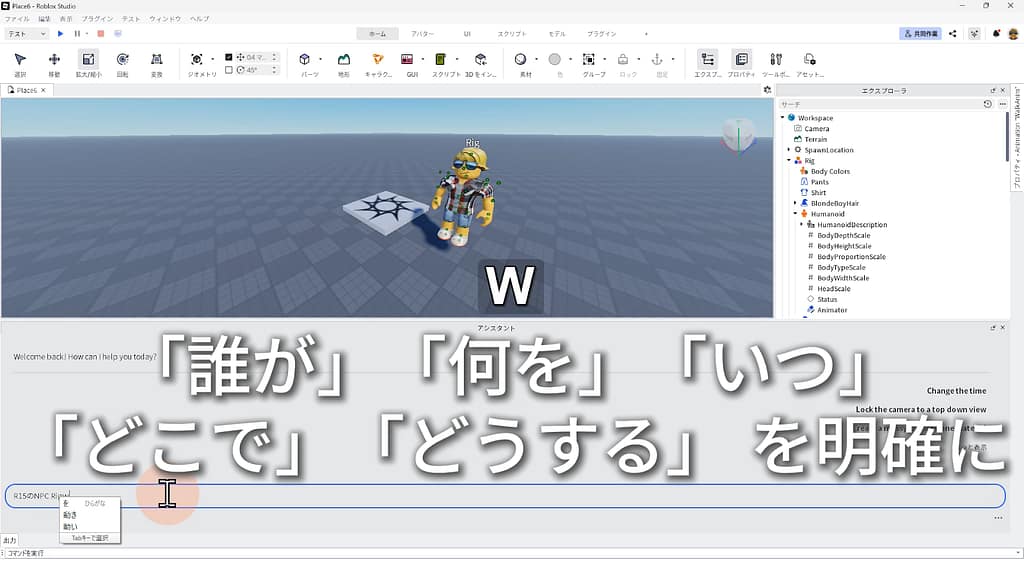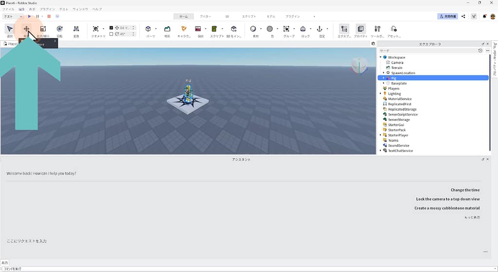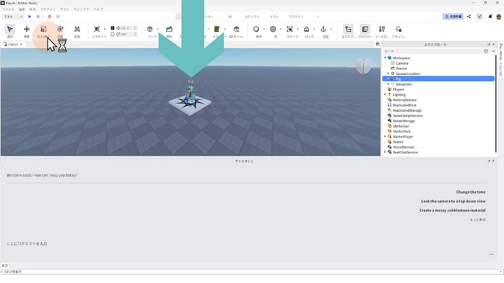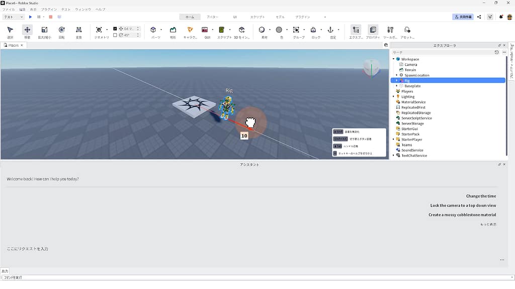 ※Rigが自然に歩き回るスクリプトを、Roblox Studioに搭載されている「AIアシスタント機能」に作ってもらいましょう。