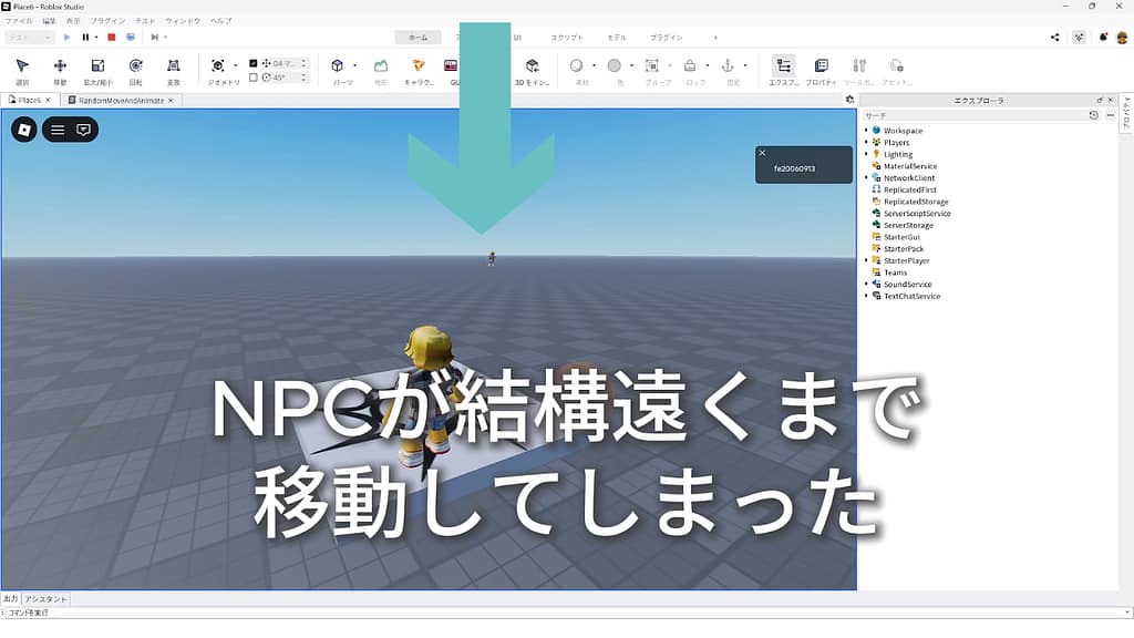 ※AIアシスタントが生成したスクリプトのままだと、NPCがBaseplate全体を歩き回ってしまいます。スクリプトを修正して、NPCの移動範囲を10分の1にしましょう。