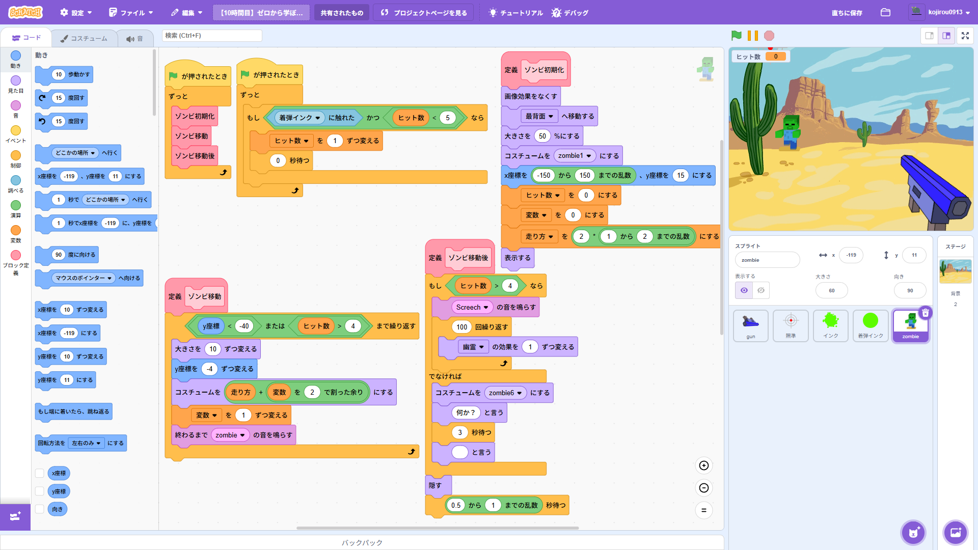 このテンプレートは、ゼロから学ぼうScratch 5時間目のゾンビのScratchプロジェクトと9時間目のFPSその1のScratchプロジェクトをマージ(合体)しています。