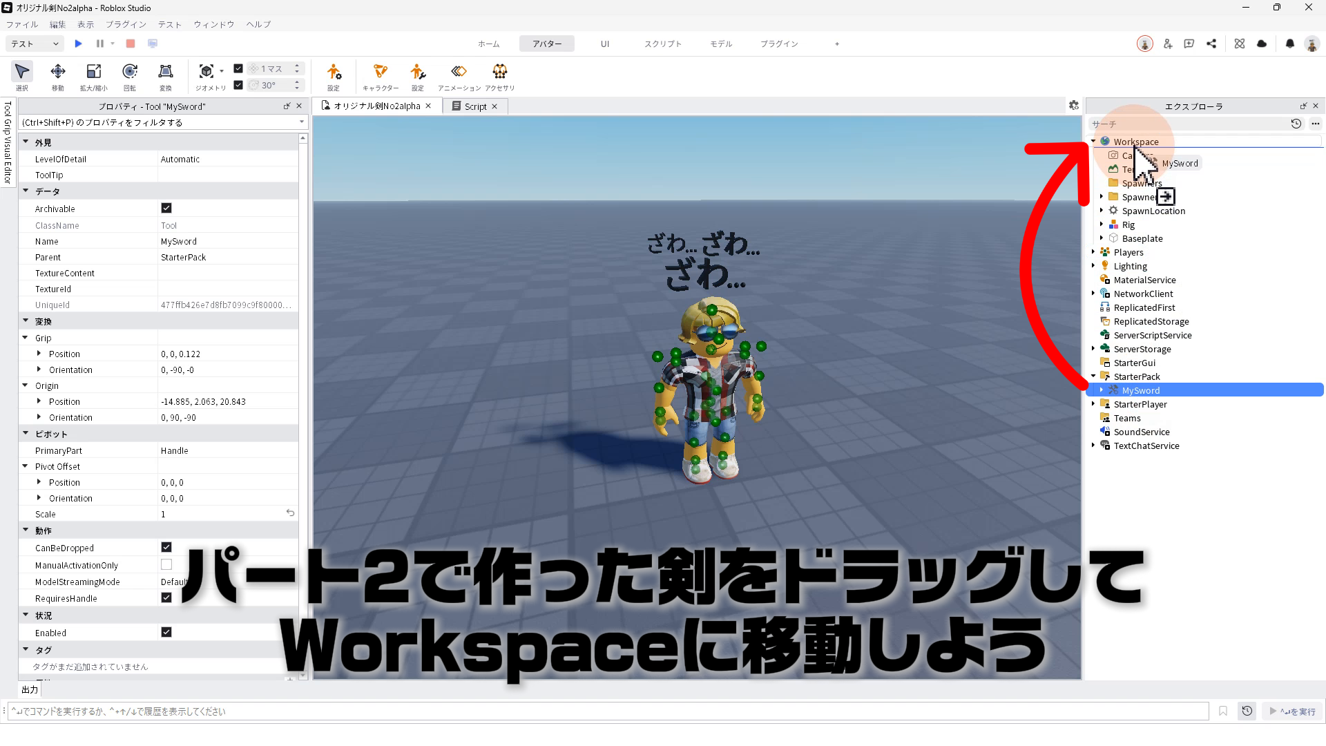 パート2で作った剣をドラッグして、Workspaceに移動する