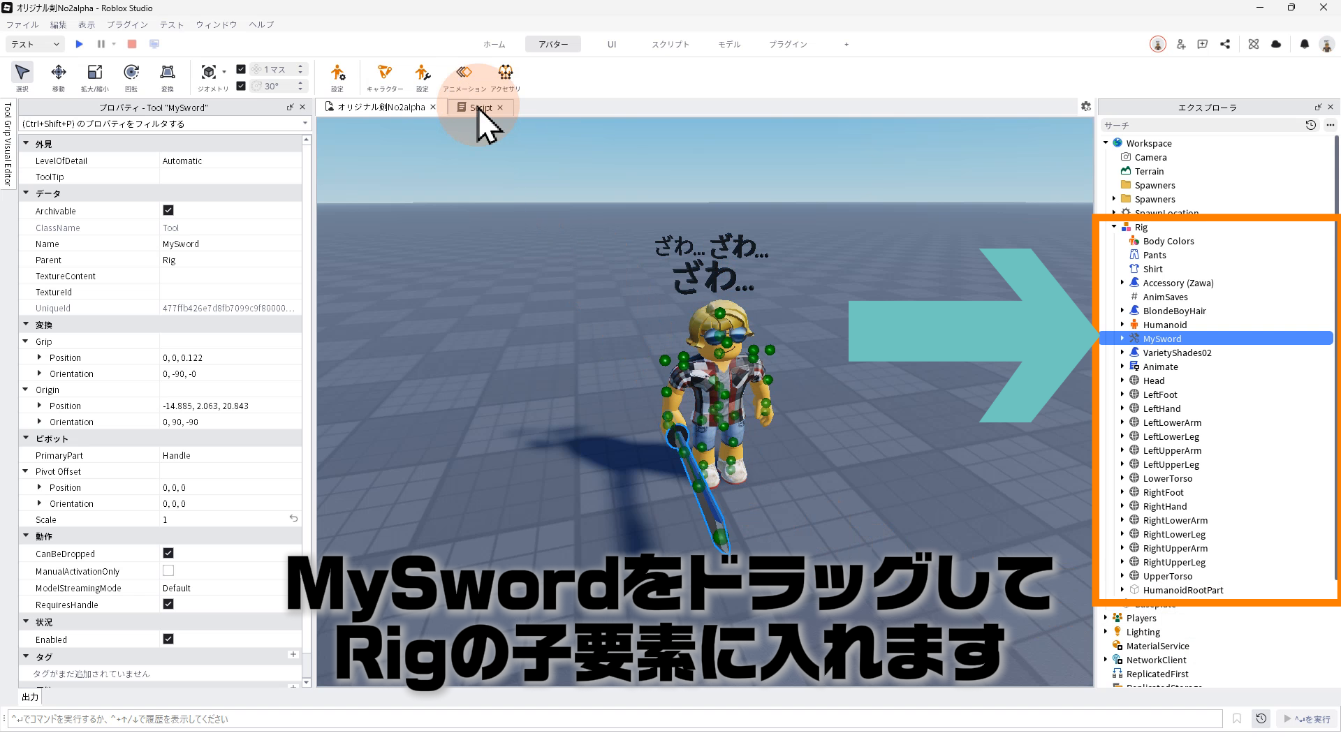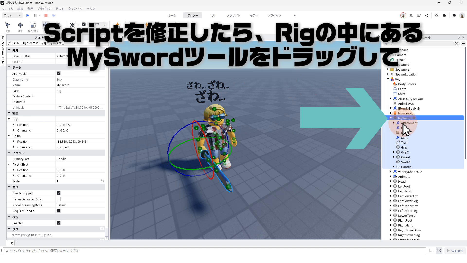 Scriptを修正したら、Rigの中にある「MySword」ツールをドラッグして