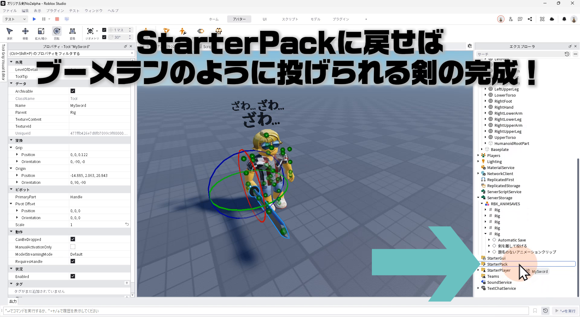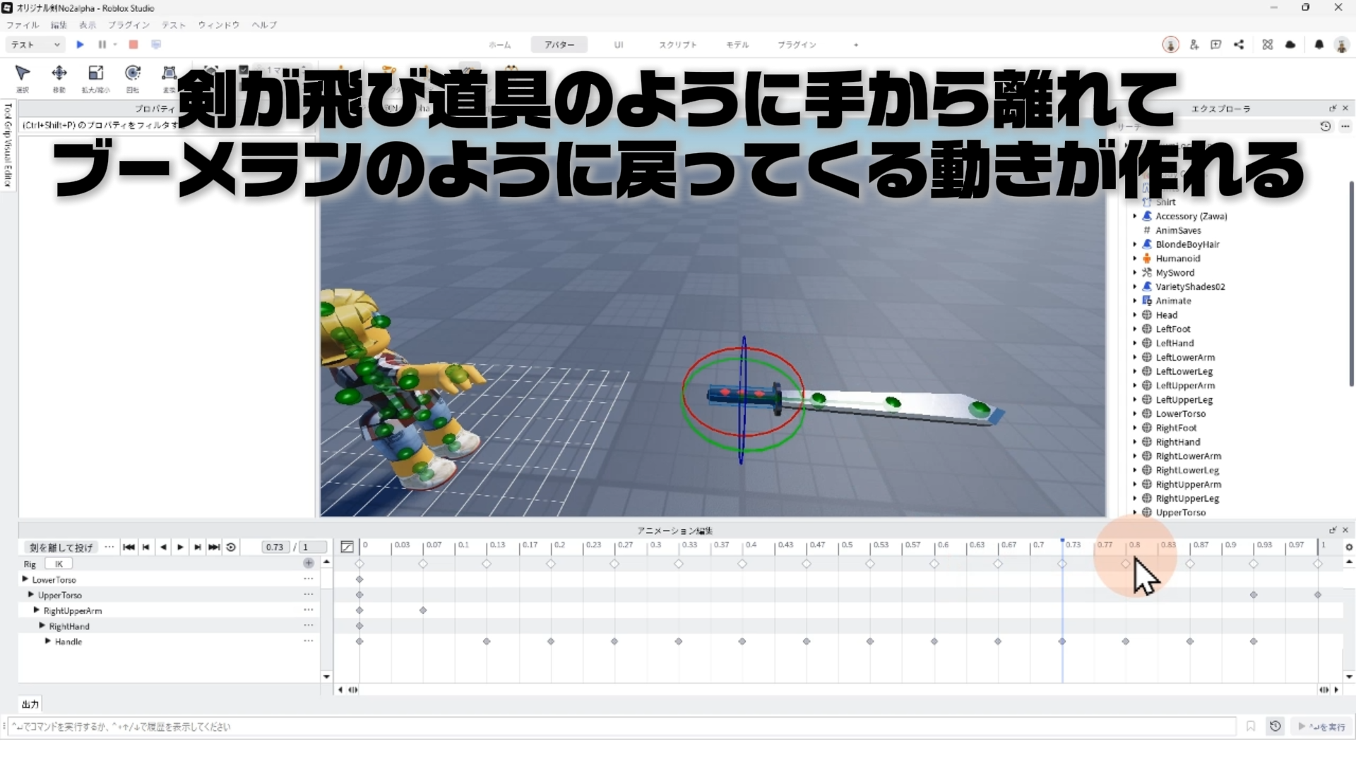 「オリジナル剣を作ろうパート2」で作った剣を、アニメーションでブーメランのように投げれるようにしよう!