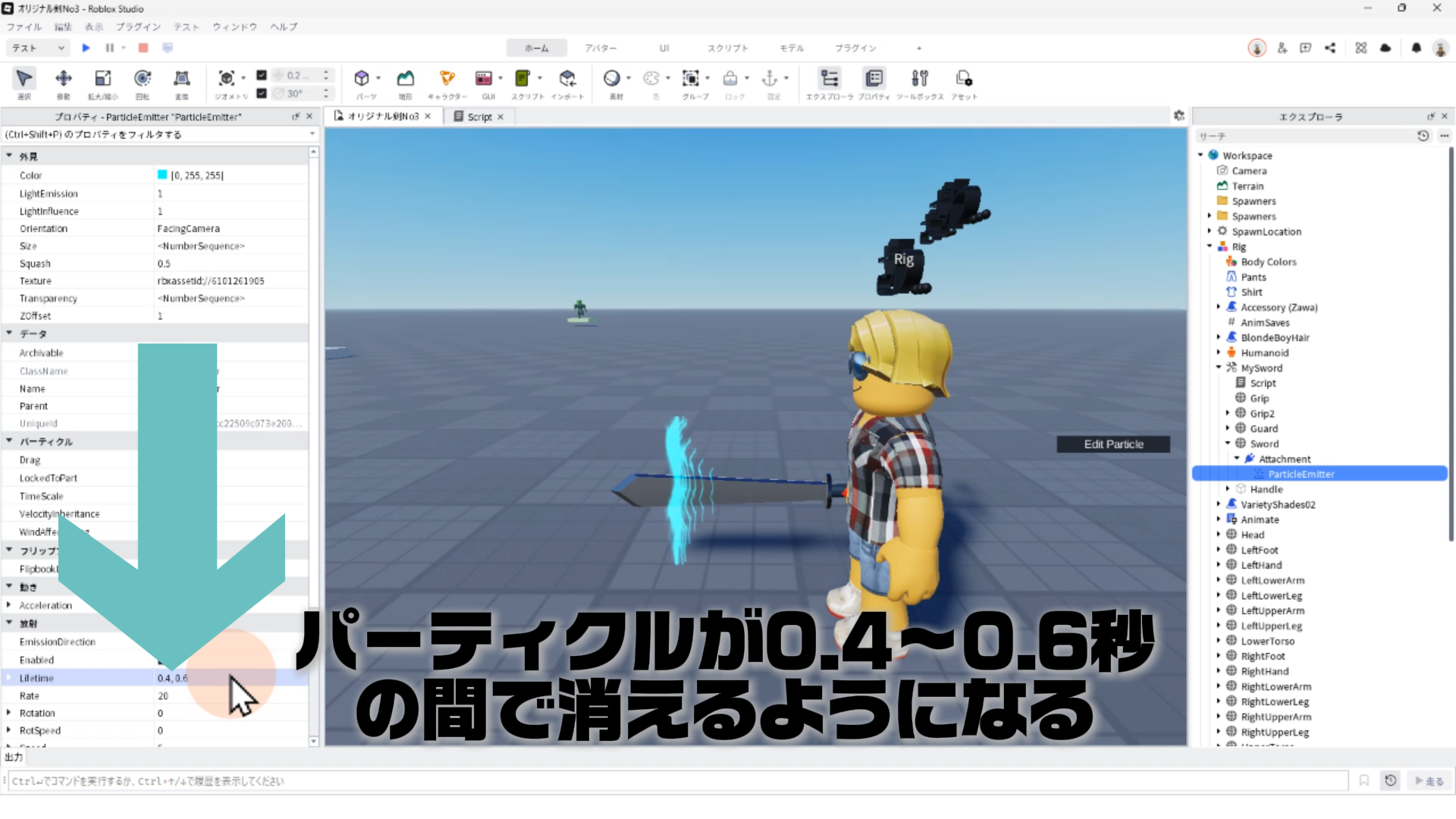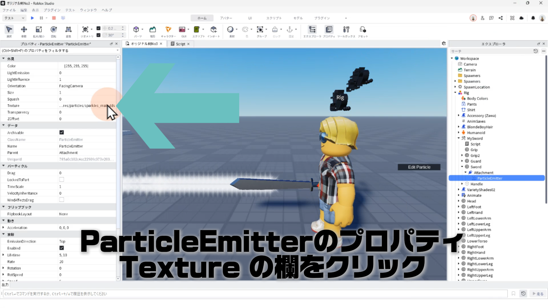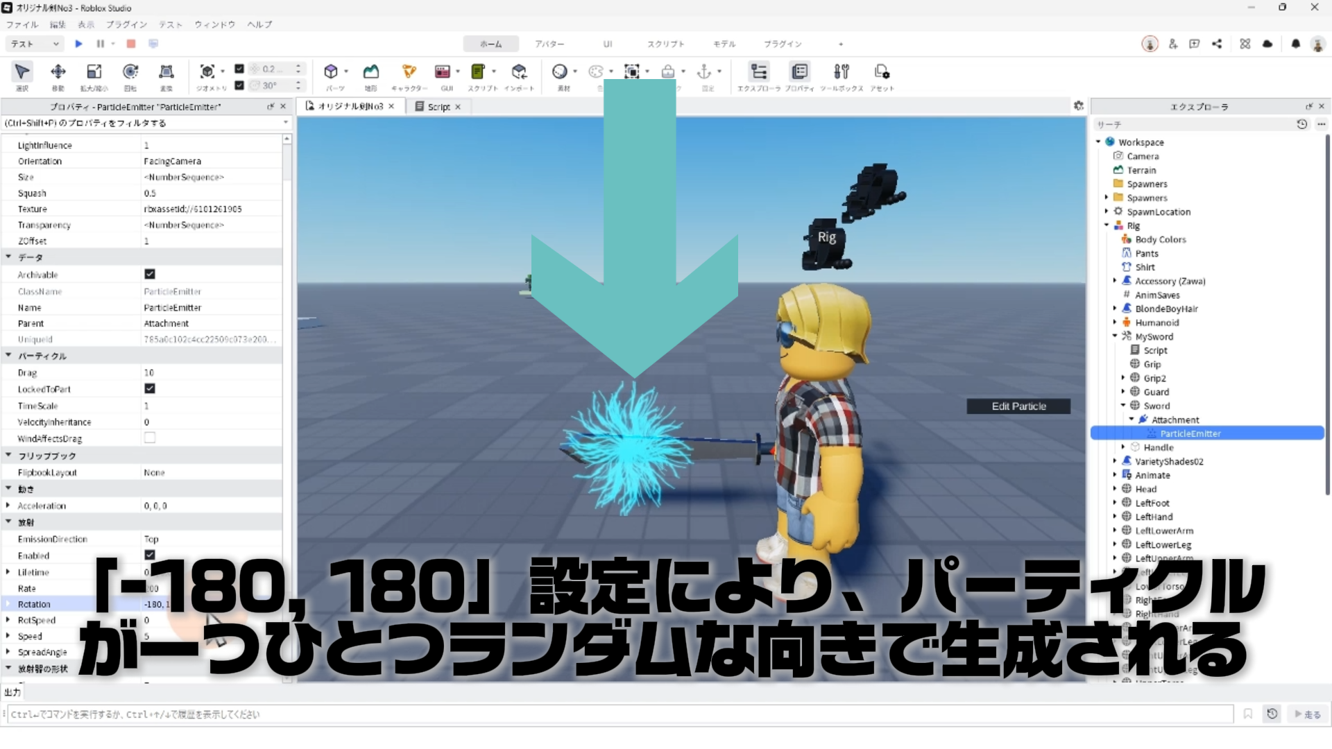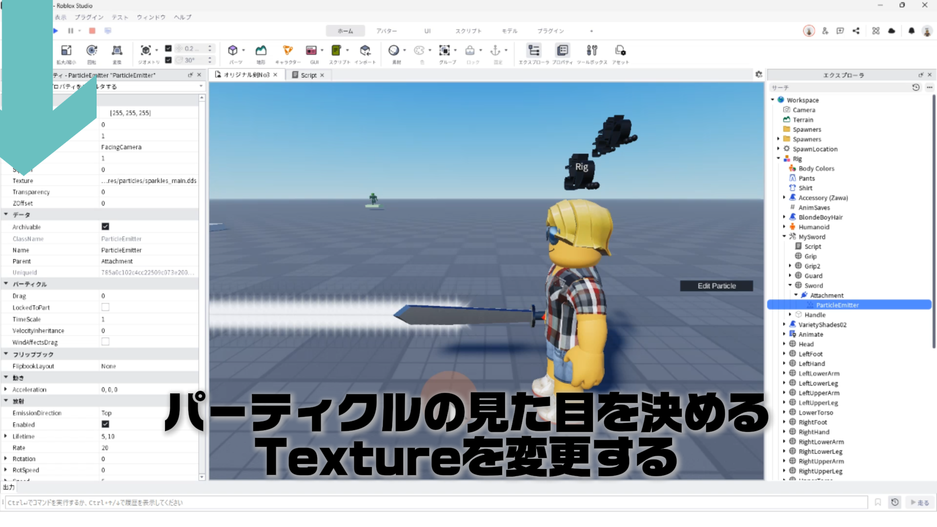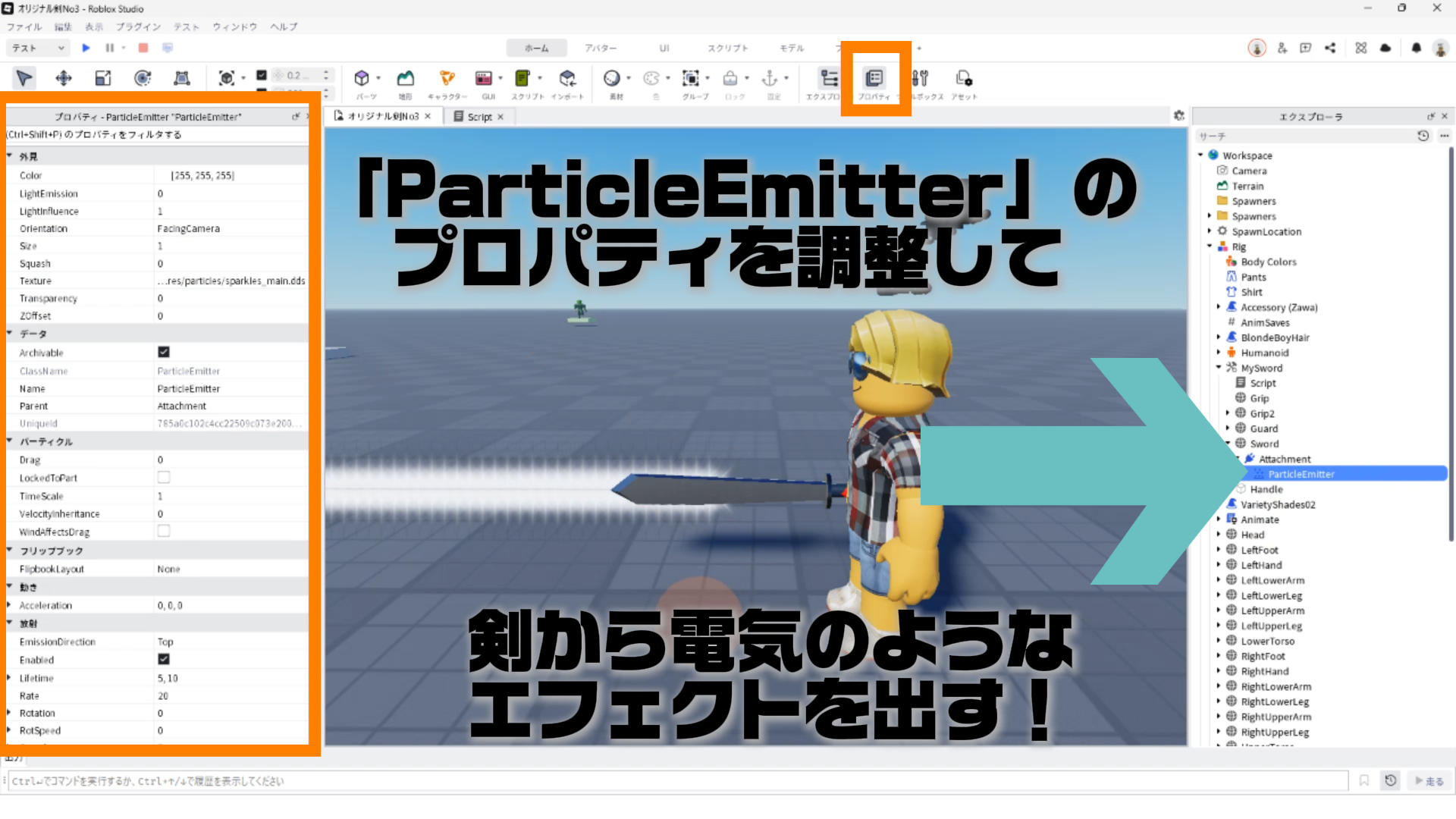 「ParticleEmitter」のプロパティを調整して、剣から電気のようなエフェクトが出るようにする