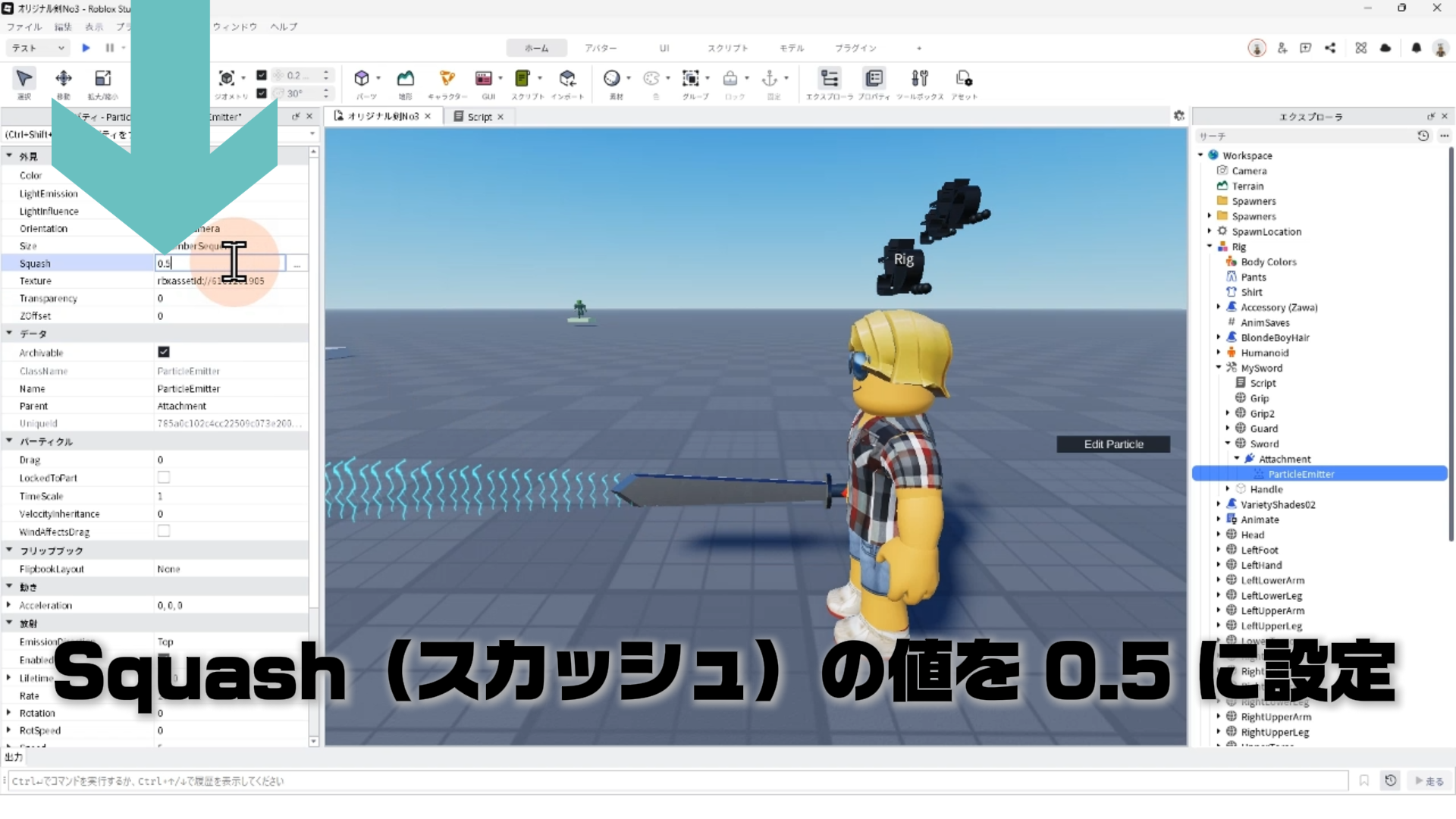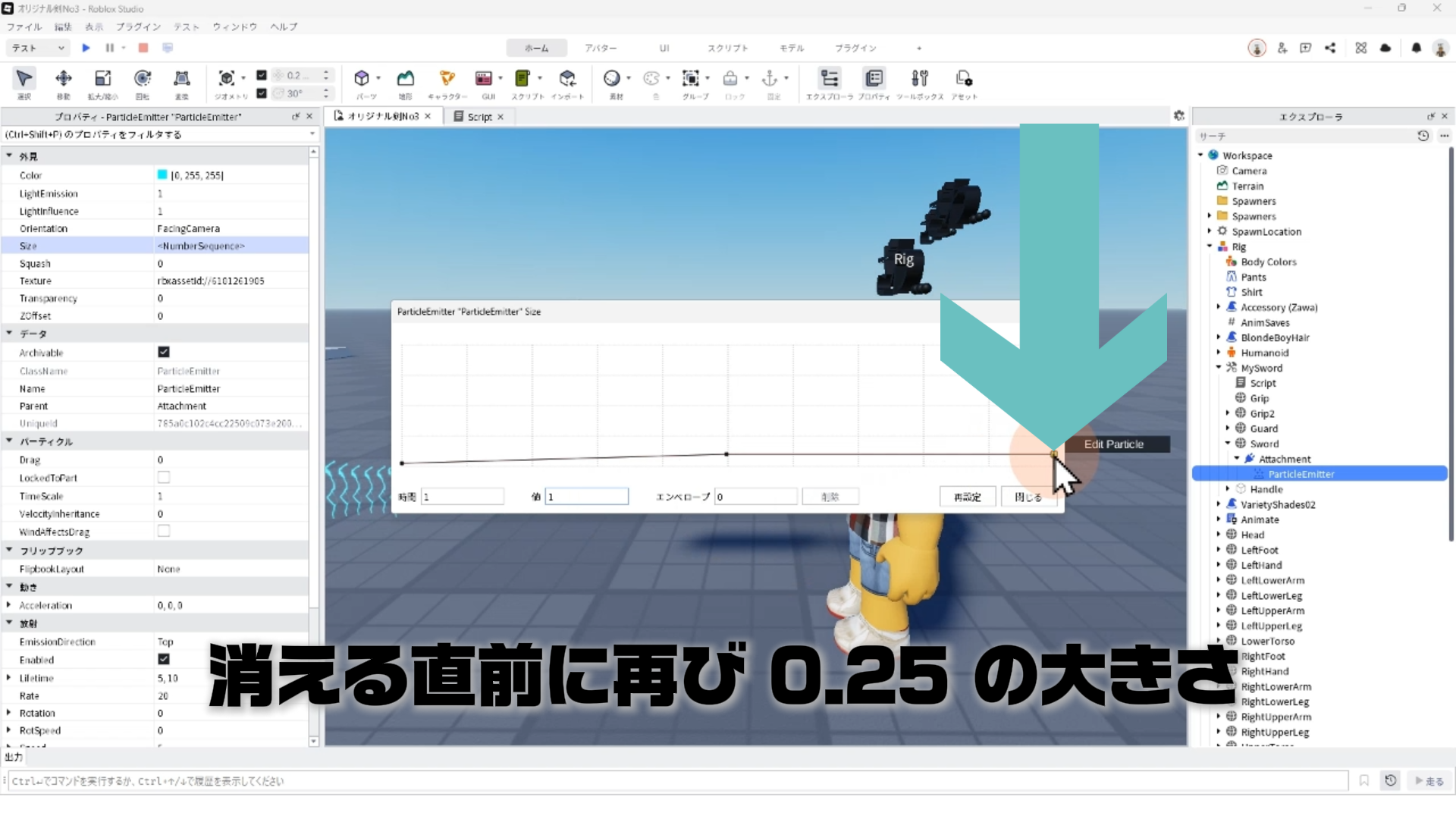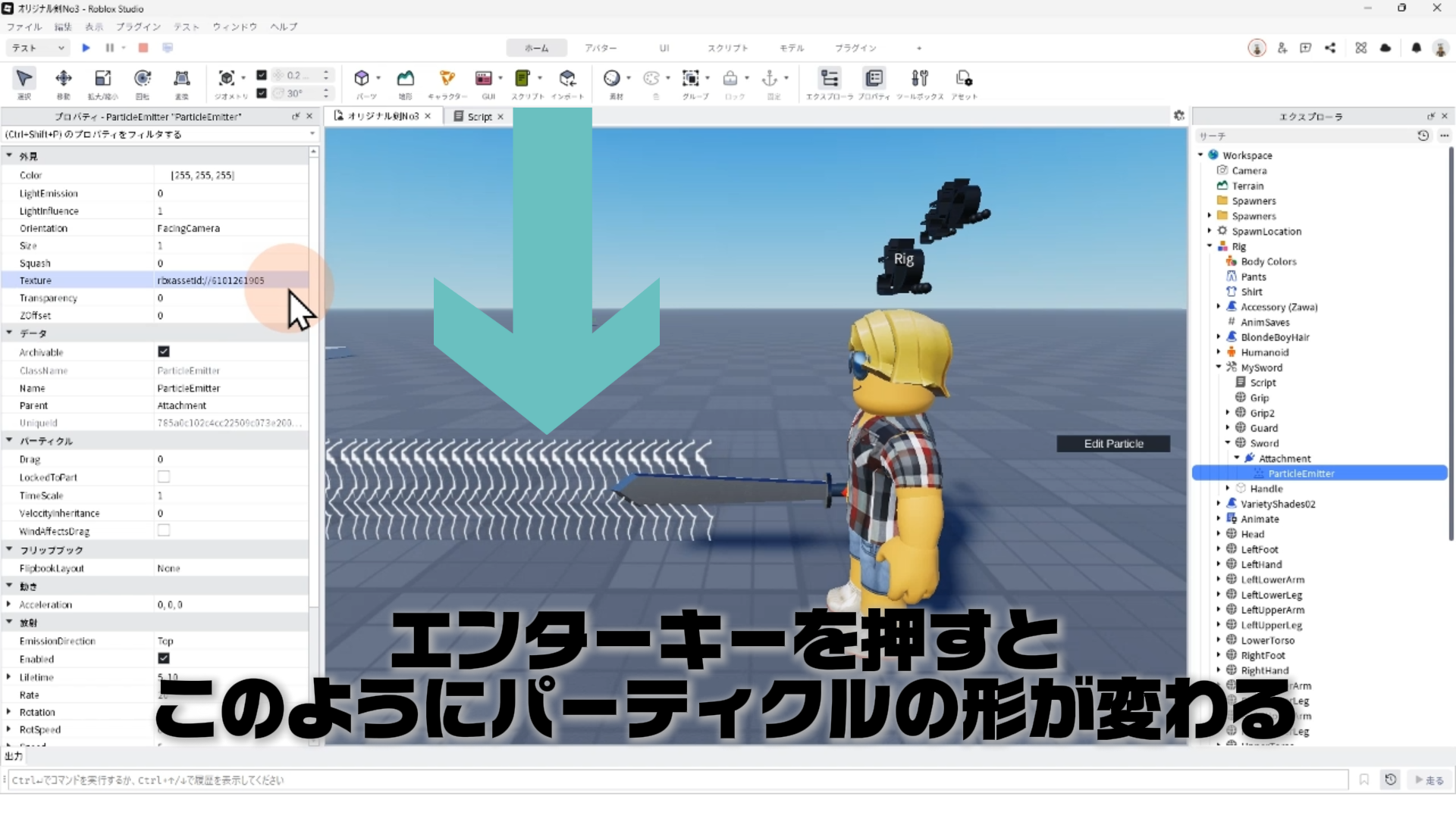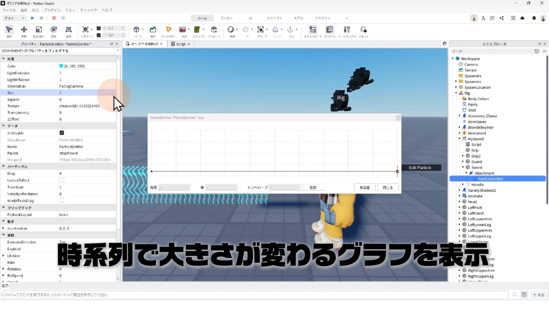 「ParticleEmitter」のプロパティを調整して、剣から電気のようなエフェクトが出るようにする