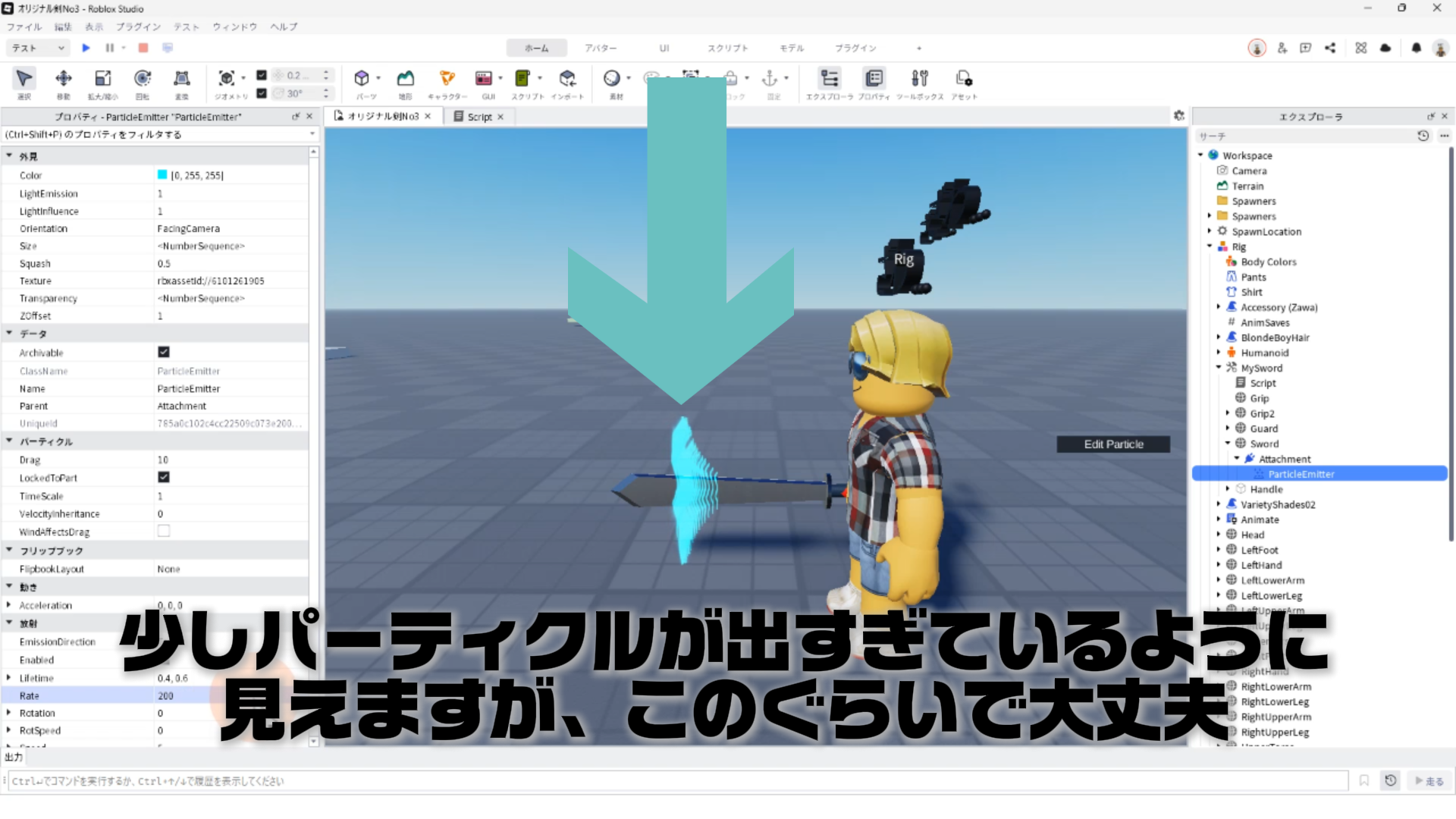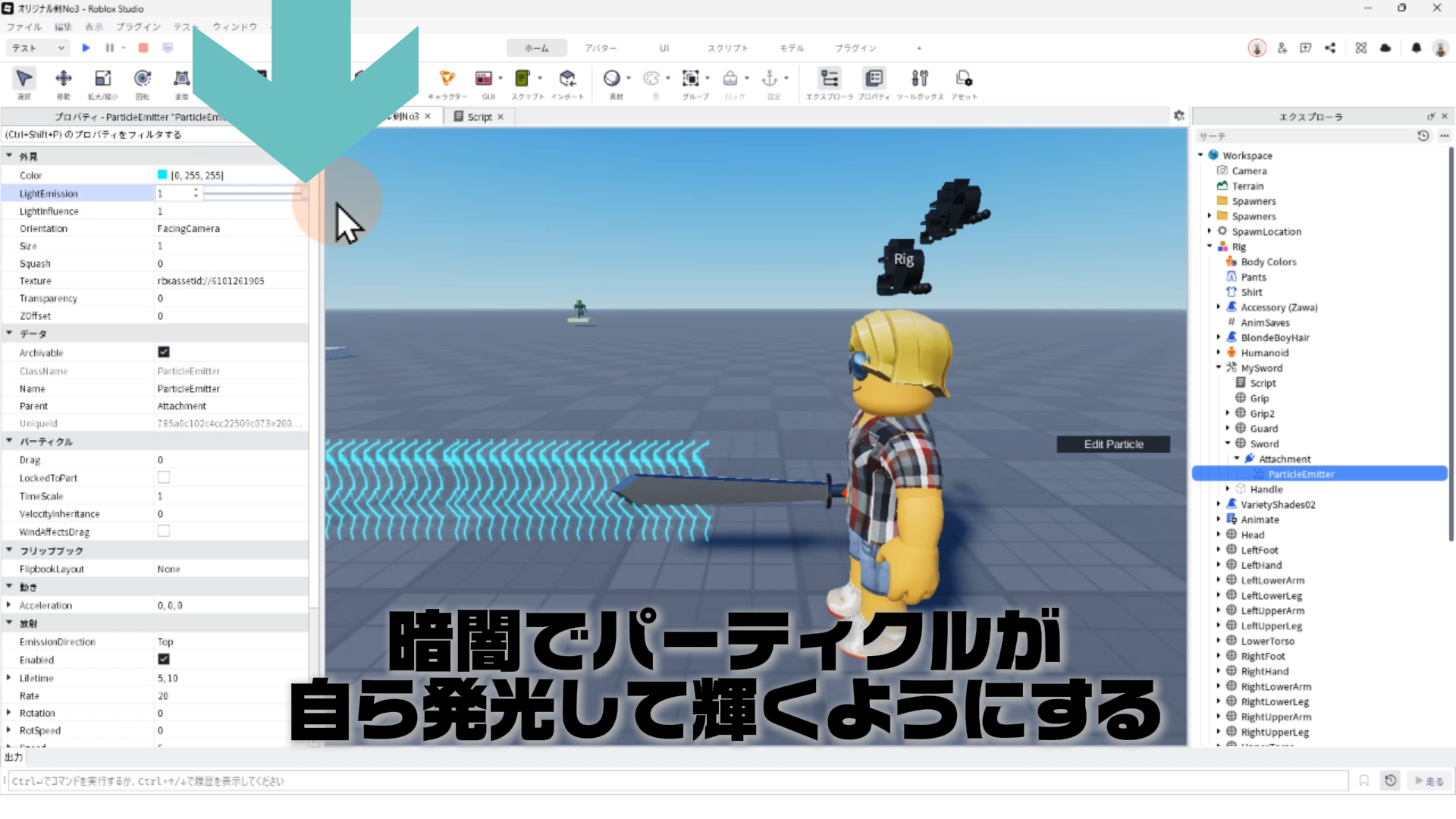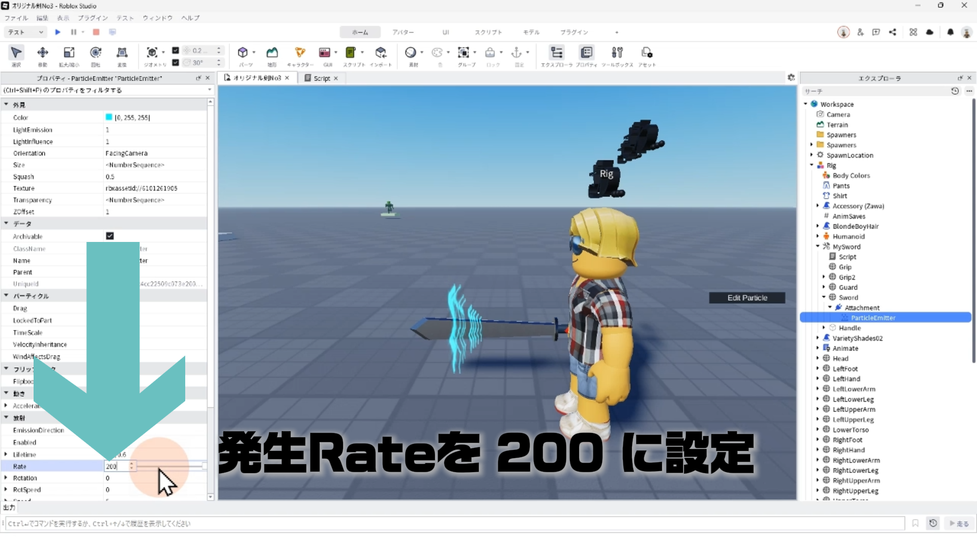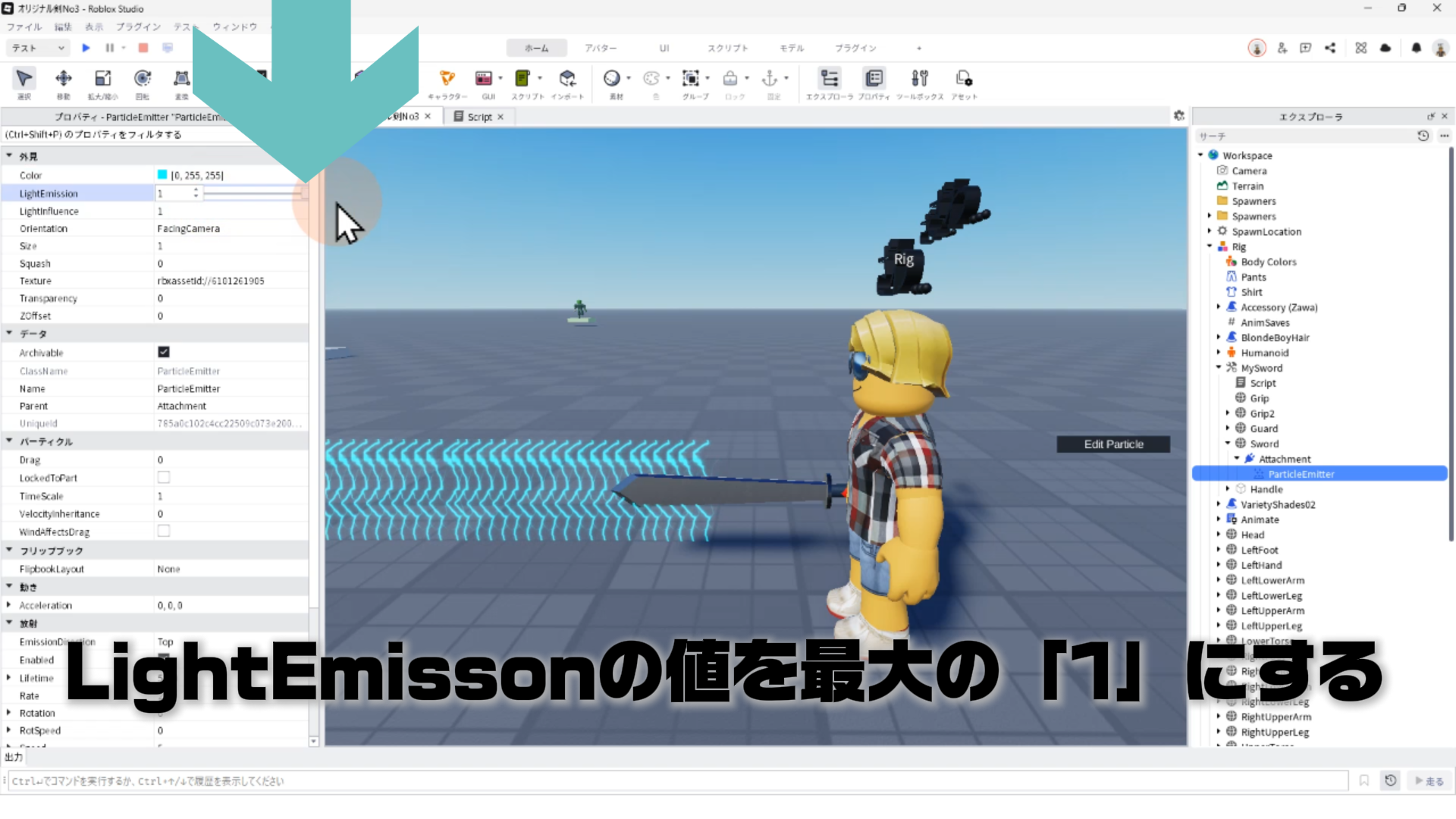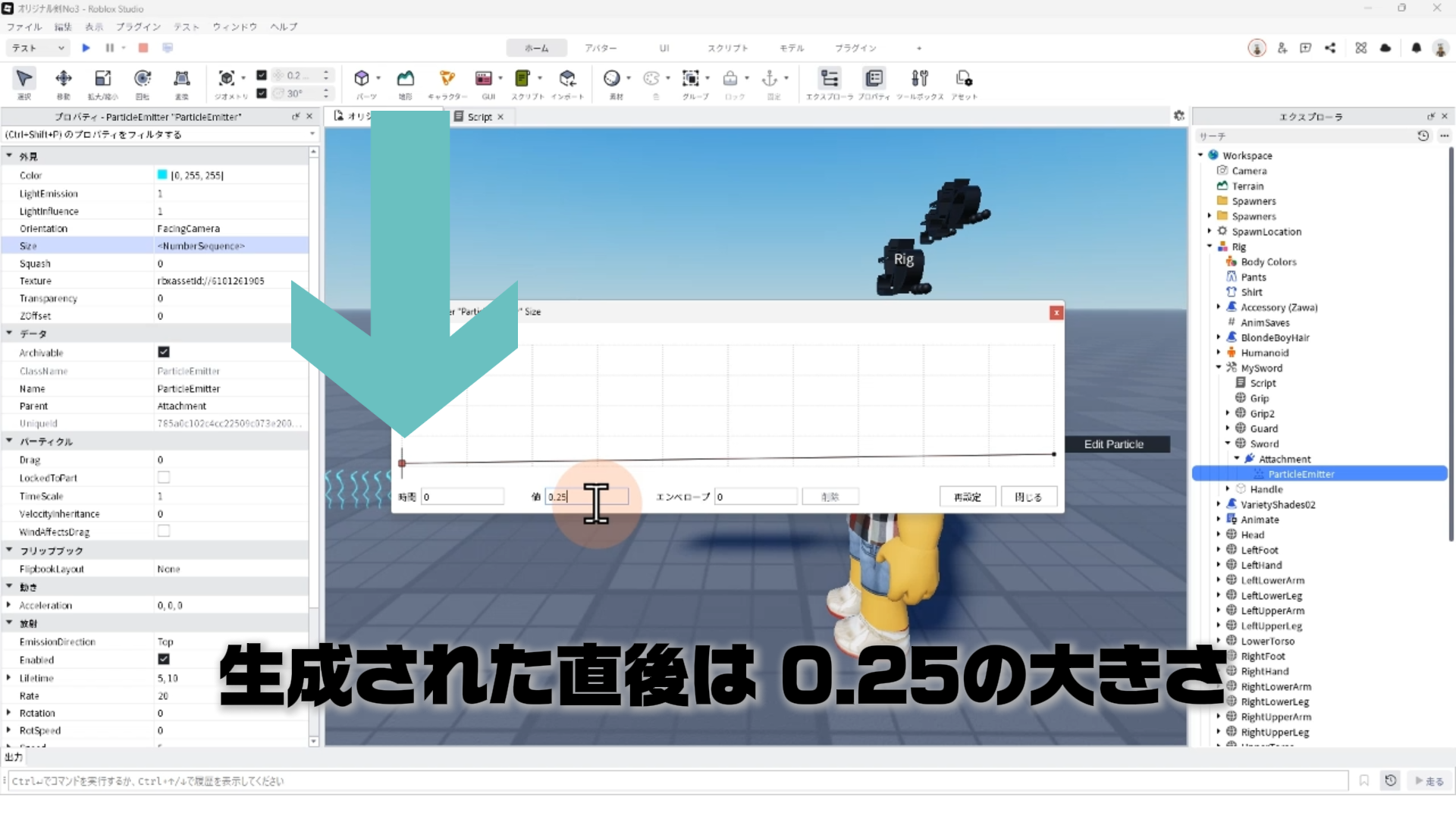 「ParticleEmitter」のプロパティを調整して、剣から電気のようなエフェクトが出るようにする