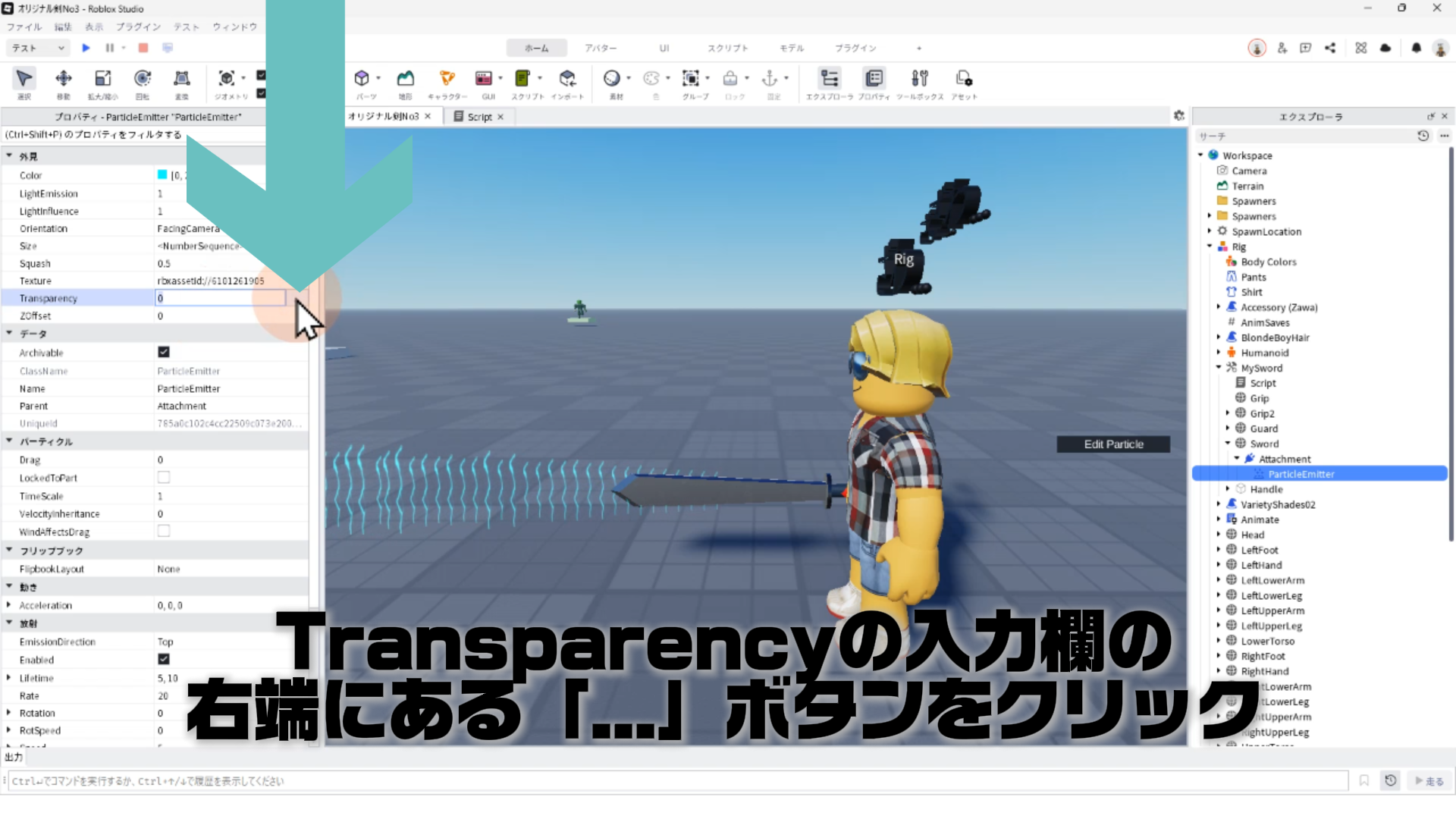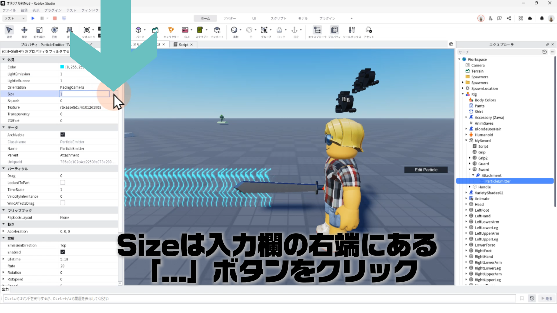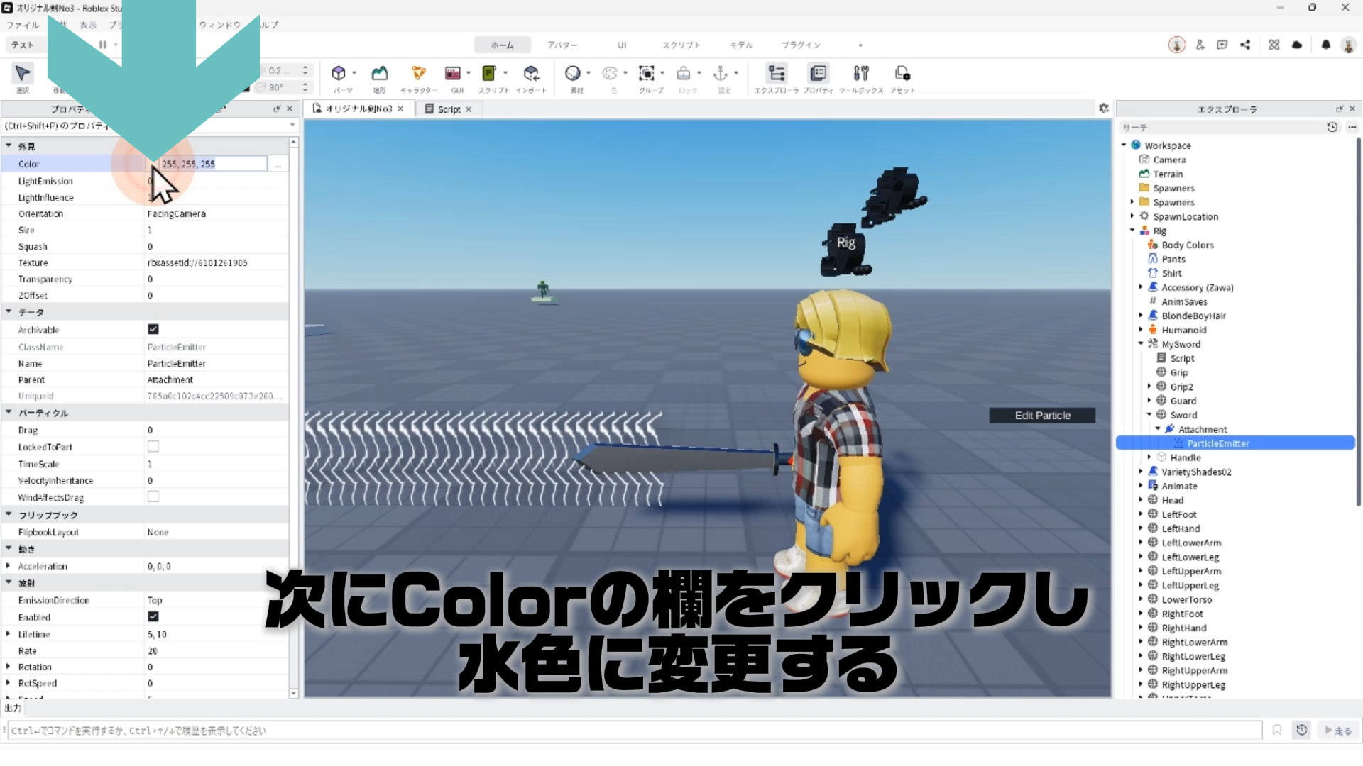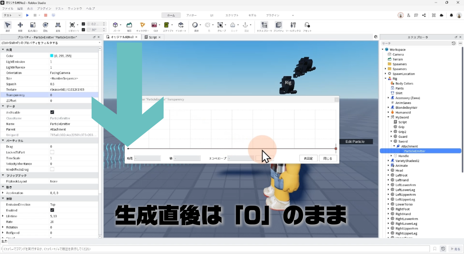 「ParticleEmitter」のプロパティを調整して、剣から電気のようなエフェクトが出るようにする