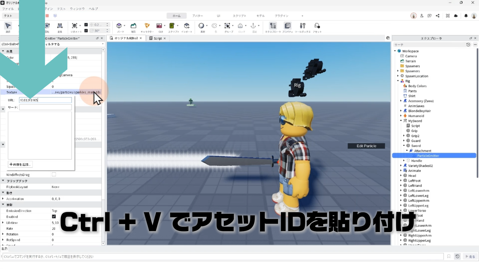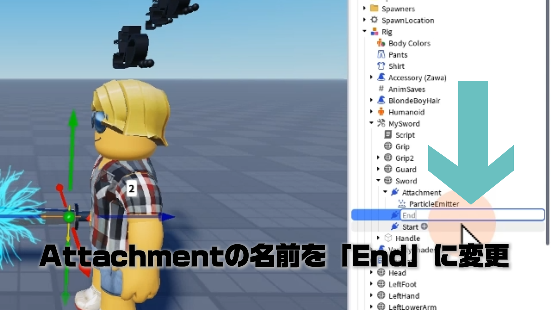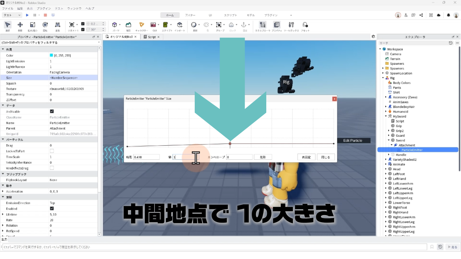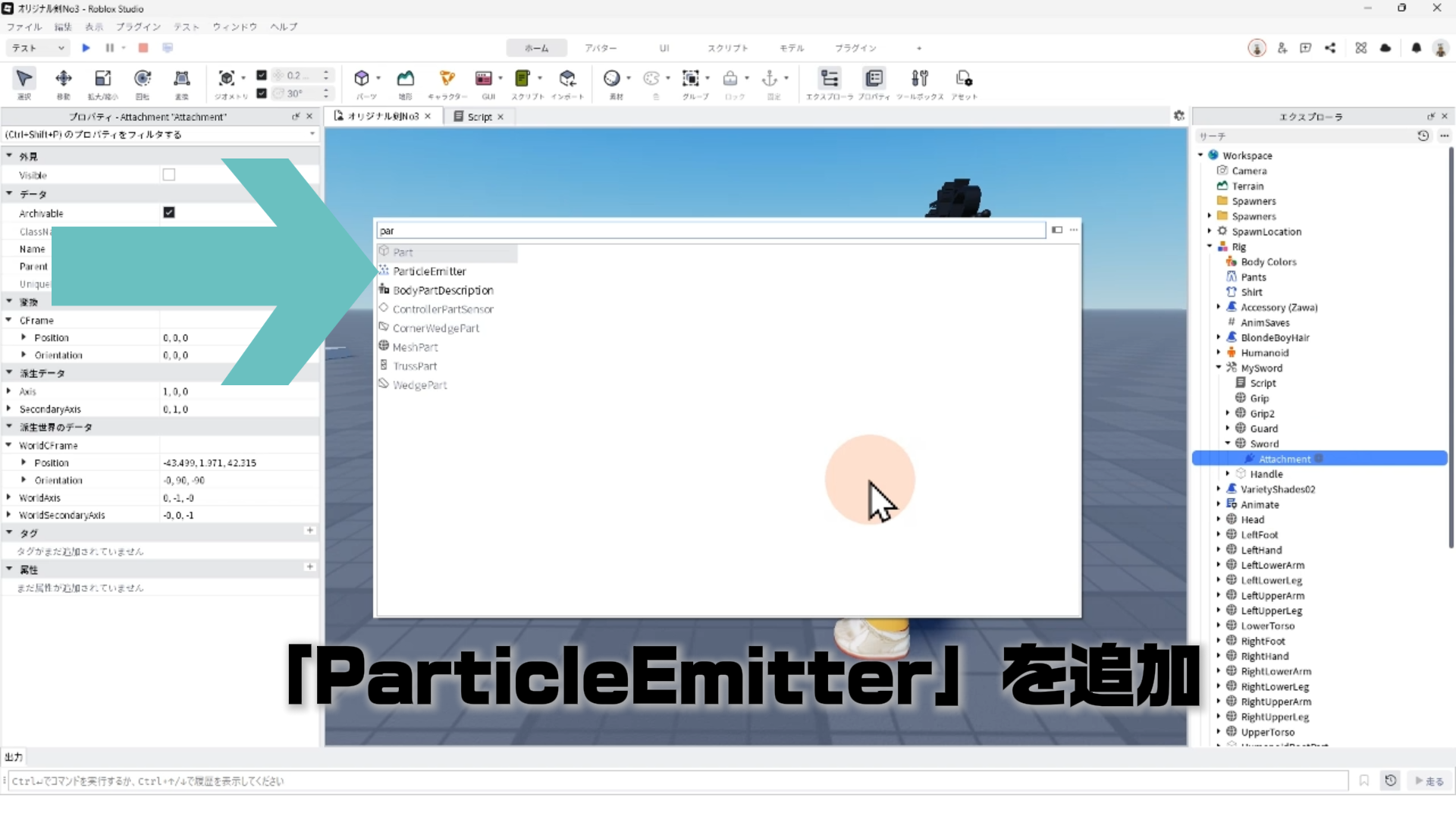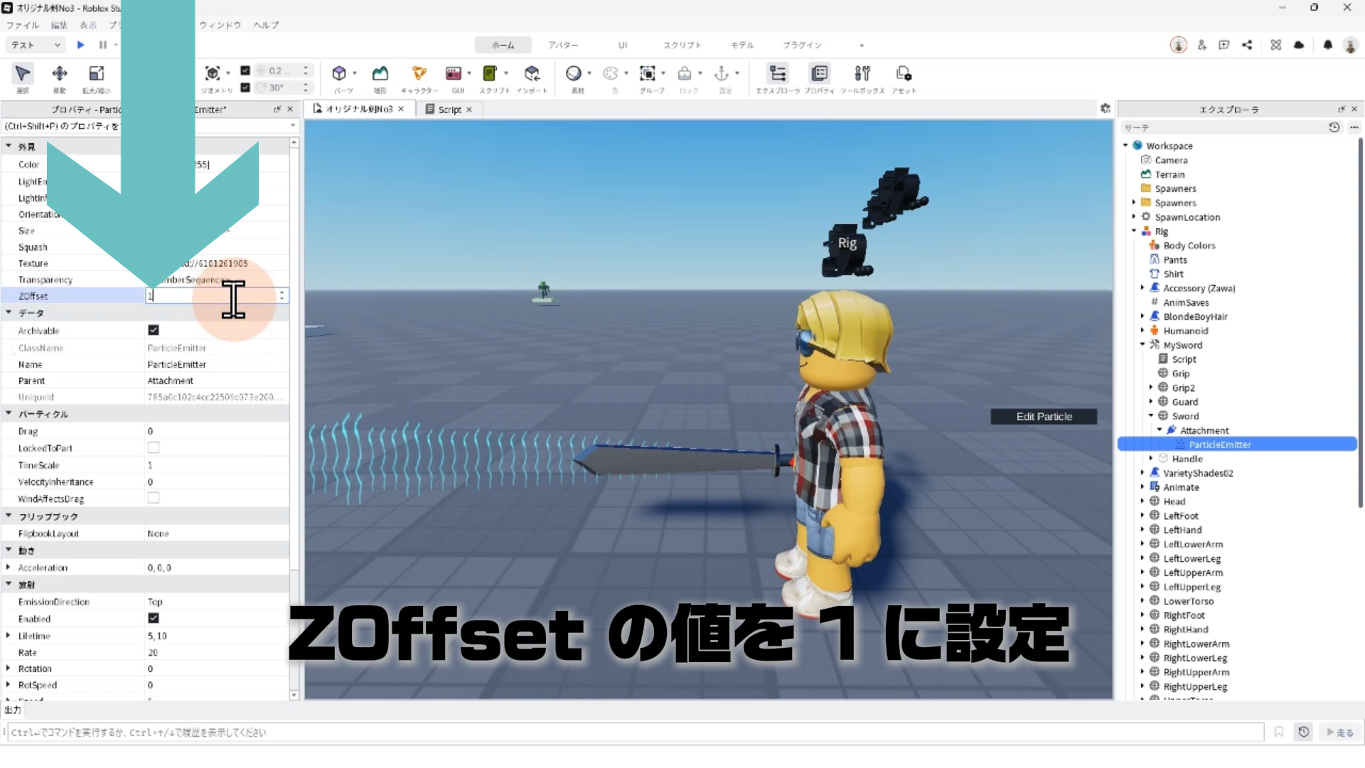 「ParticleEmitter」のプロパティを調整して、剣から電気のようなエフェクトが出るようにする