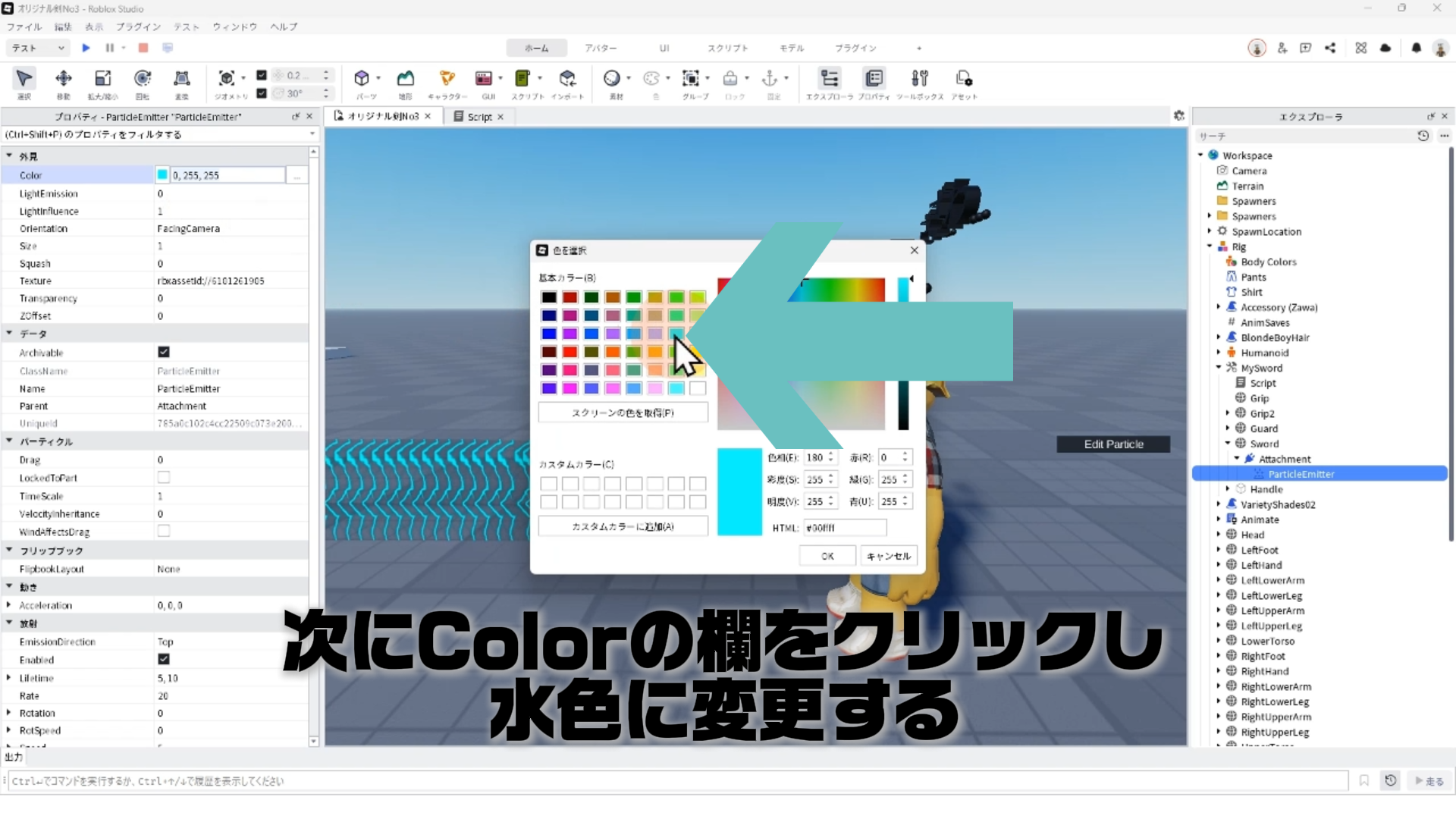 プロパティ設定2:Colorの欄をクリックし、水色に変更しよう!