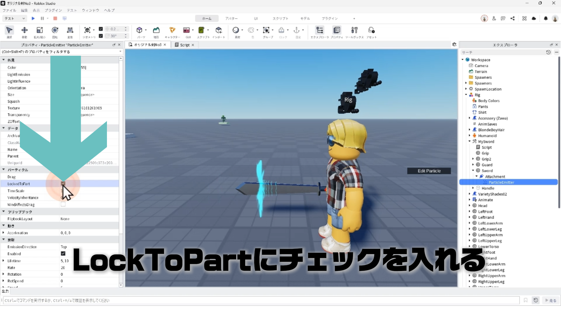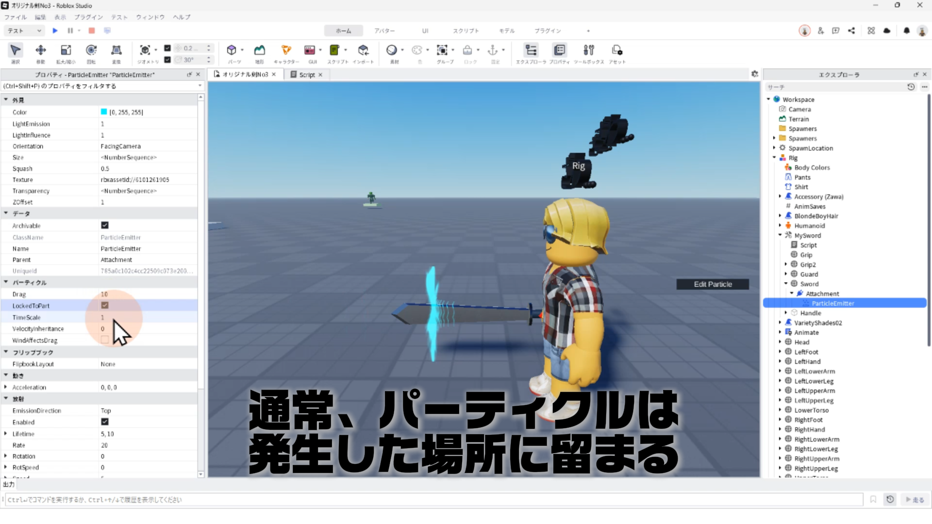 LockToPartにチェックを入れると、パーティクルが親要素(ここではSword)に固定される
