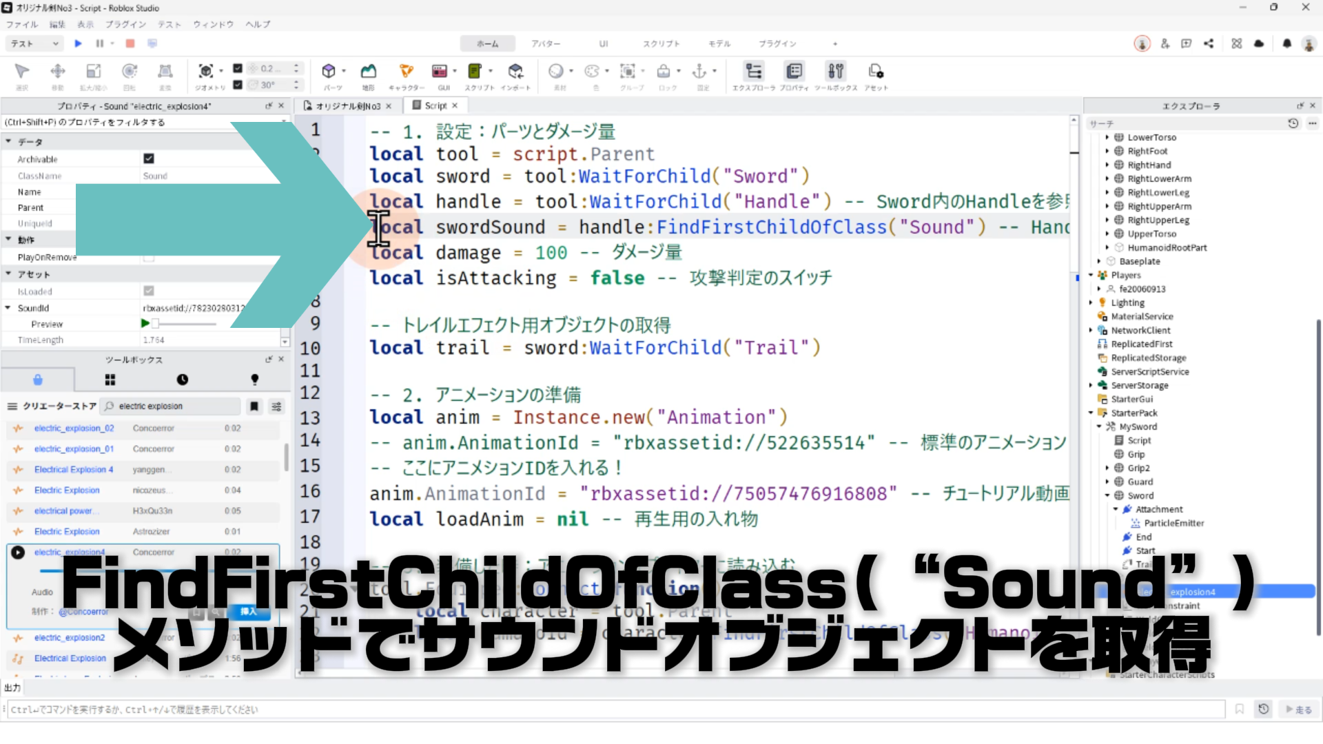 FindFirstChildOfClass(“Sound”)メソッドでサウンドオブジェクトを取得する