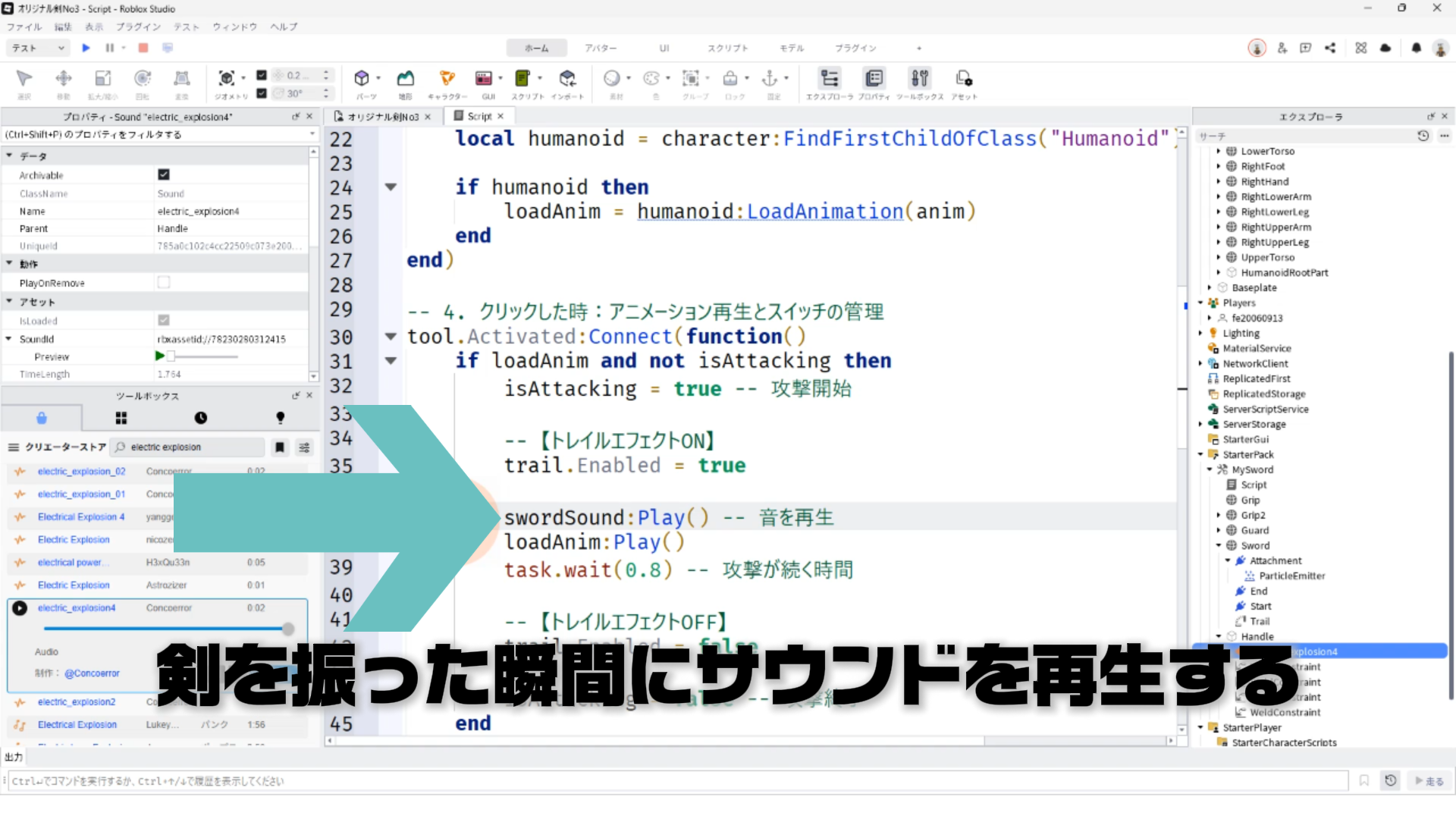 剣を振った瞬間にサウンドを再生するコードを追加